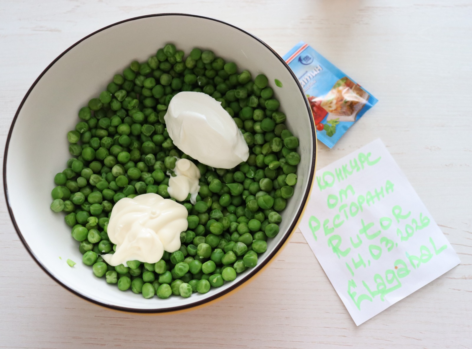4. Соедините в миске отварной горох, сметану и майонез и тщательно пробейте блендером.
