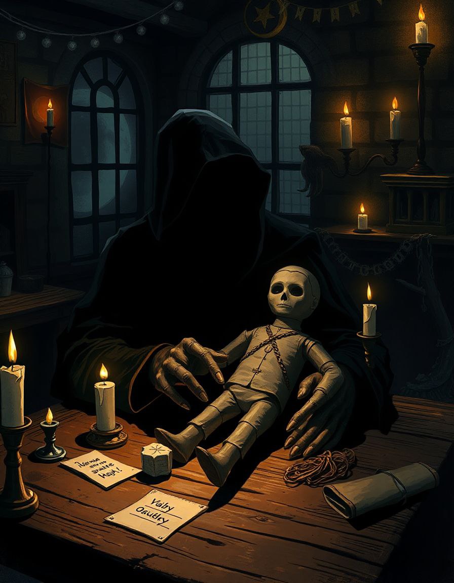 Произнес чернокнижник, не поднимая головы и продолжая своё занятие. Он лишь жестом пригласил тебя сесть рядом. Протянув тебе материалы для новой куклы, твой собеседник продолжил рассказ, помогая тебе провести твой первый обряд порчи. Его голос звучал спокойно, отзываясь едва уловимым эхом в этом мрачном помещении.